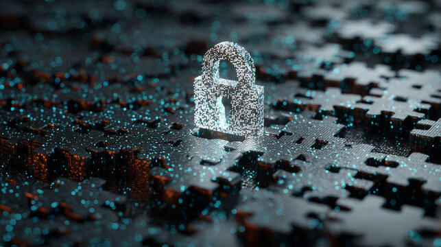 Glowing digital padlock on a dark puzzle piece surface with scattered sparkling light particles around it