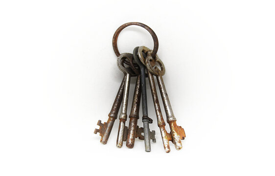 A bunch of rusty antique keys on a ring