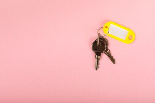 Set of yellow price tags and keyrings. Price stickers. Luggage tag. Cardboard label for clothes. Key tags with split ring and window. Keychains