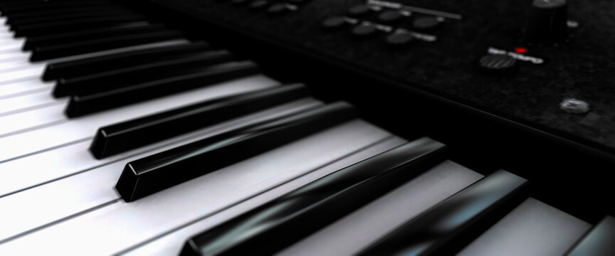 World piano day. Piano keyboard keys sign. instrument. Music notes, musical waves staff, line pattern symbols. Vector key stave background banner. Classic clef Doodle quaver G melody. Cartoon signs.