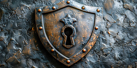 A beautifully crafted shield featuring a keyhole design, symbolizing protection and security in a vintage style with metallic textures and details.
