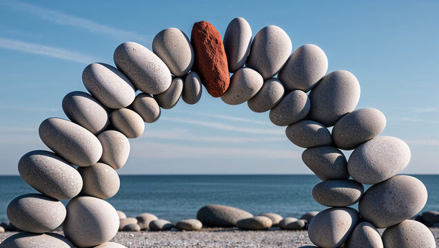 Arch of white pebbles with a red keystone supporting on a beach with clear sky