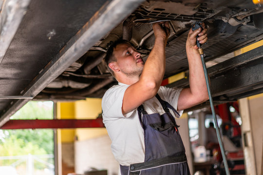 Mechatroniker bei der Reparatur von Auto Auspuff