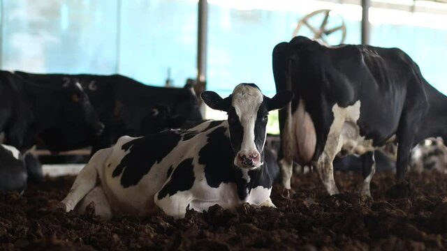 A group of Israeli cows in black and white, in a barn on a kibbutz in Israel