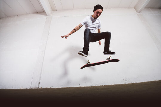 Advanced skateboard ollie double kickflip trick, wet rain studio, caucasian man