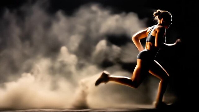 A determined female athlete runs, kicking up a cloud of dust against a dark background. Slow motion, lateral tracking shot. 4K.