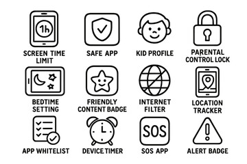 Digital Safety Icons. Digital safety for kids doodle icon set: hand drawn icons of screen time limit, safe app icon, kid profile,