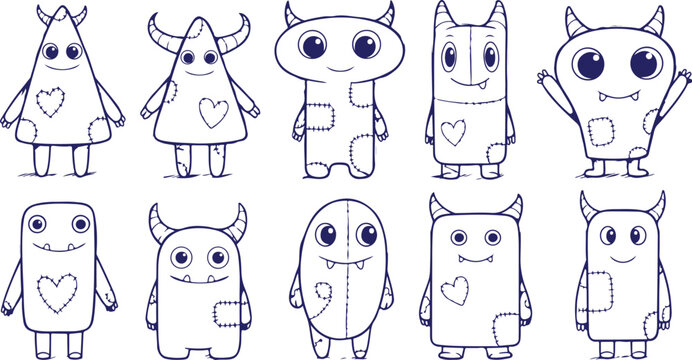Vector art of cute hand drawn cartoon monsters set, friendly characters, isolated on white