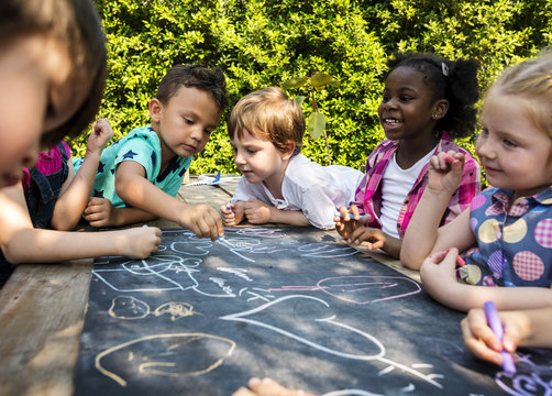 Group of kindergarten kids friends drawing art class outdoors