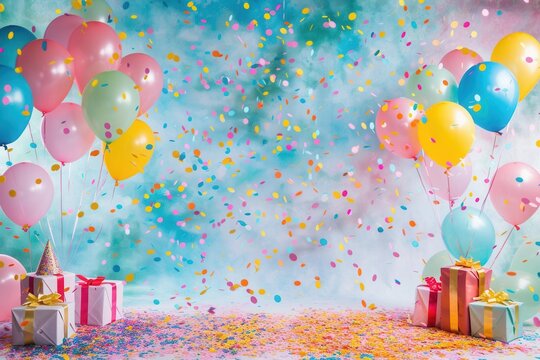 A joyful backdrop for a childs birthday party, featuring balloons, confetti, and presents. Perfect for photo studios and event planning. Generative AI