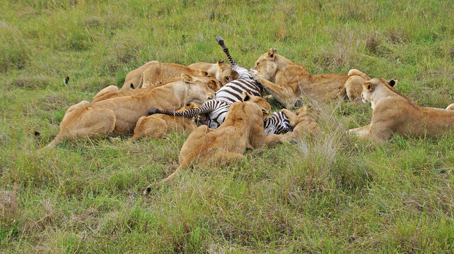Lionesses hunted zebras. A family of lions eats a hunted zebra. Lionesses have killed a zebra in the Masai Mara National Park and are eating with their kittens. Hunting in the wild.