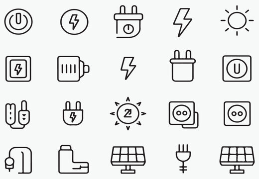 Line style icons of power use planning: kilowatt diary, low-use hour icon, off-peak marker, demand curve chart, week trend line, daily usage cap, high-consumption flag, energy plate icon.