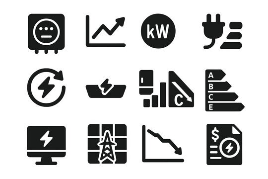 Energy Usage Icons. Solid style icons of power usage: energy meter icon, consumption graph, kilowatt icon, plug with stats,
