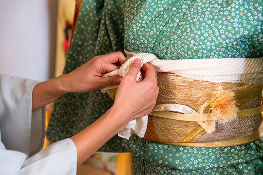 Japanese, Okinawan woman's hands tying obiage cloth around the obi during traditional kimono dressing