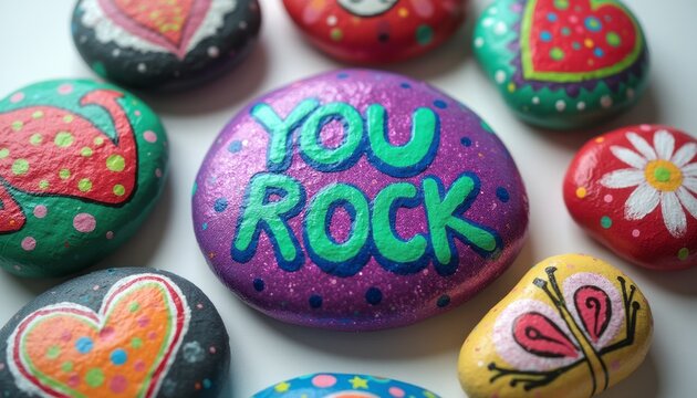 A collection of beautifully painted rocks showcases a central purple stone boldly declaring You Rock in bright green letters. Surrounding it are various colorful designs, including hearts, flowers