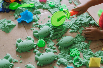 Background pink kinetic sand for children with copy space. Magic sand for children`s creativity