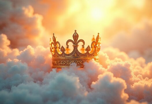 Golden crown floating in sunset clouds. Divine kingship concept. Religious symbolism for Easter, Ascension Day, or Christ the King Sunday. Heavenly royalty illustration.