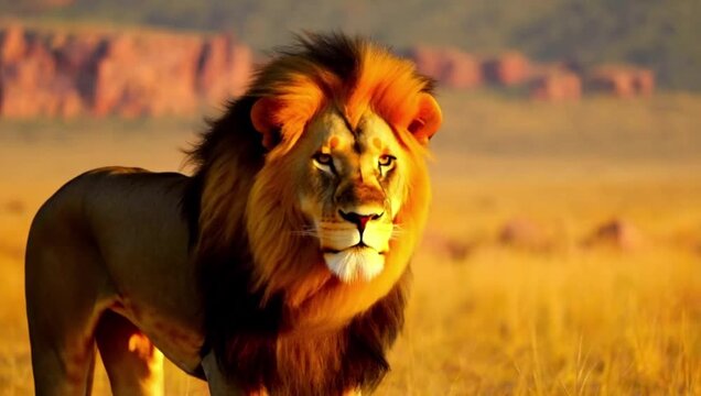 Majestic male lion walks through desert at golden sunset. Lion of Judah Jesus Christ, spiritual strength, kingship. Powerful biblical animal represents faith, divine leadership in wilderness,