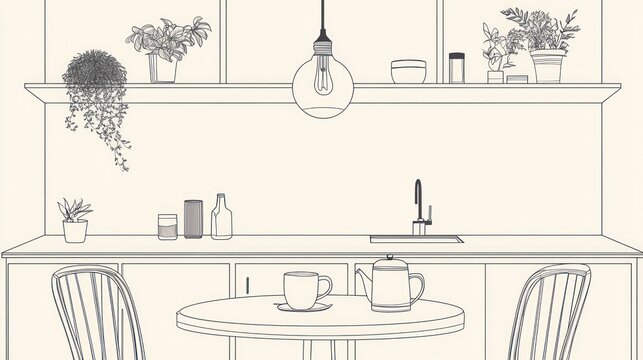 Interior design with modern kitchen in black line sketch on white background , vector , illustration