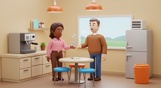 3D stylized cartoon office colleagues sharing coffee in modern kitchen background