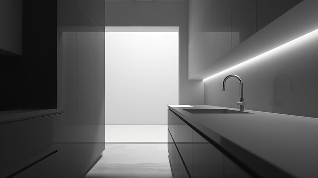 Sleek modern kitchen design in monochrome, featuring minimalist cabinetry, integrated lighting, and contemporary appliances.