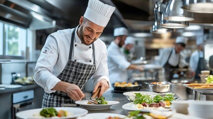 Chef creating gourmet meal in kitchen highlighting culinary expertise technique. AI generated