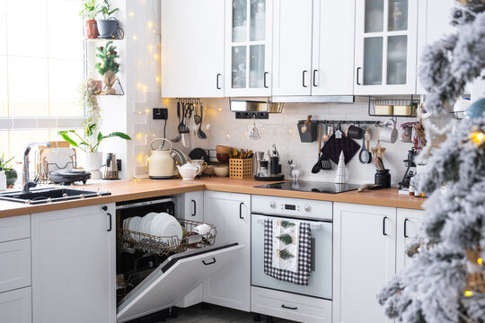A lot of dirty dishes in the dishwasher in the festive kitchen. Helping the hostess, economy and ecology. Cleaning in the kitchen for the holidays of Christmas and New Year, after the feast and guests
