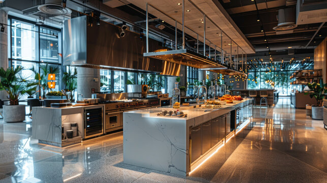 Culinary Craft: A vibrant kitchen scene where chefs are bustling around, focused on creating dishes, and the cooking equipment ready for use.