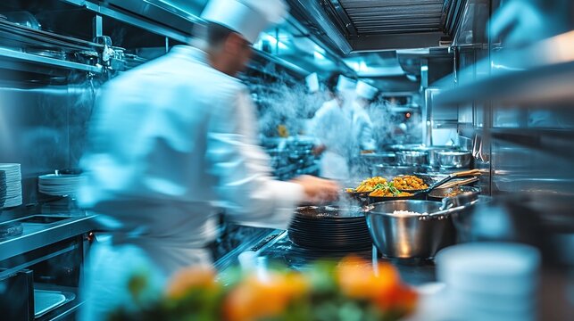 Elegant catering service promotion with skilled chef and vibrant kitchen