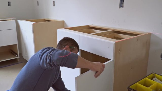 man using screwdriver to install a kitchen cupboard