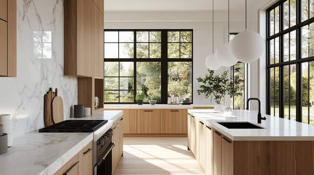 Luxury home interior design. Modern kitchen with dining area and living room in a common space