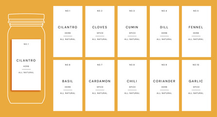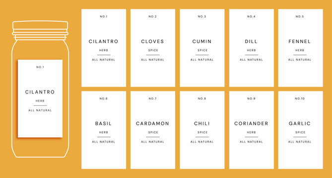 kitchen pantry labels premade design template for herbs and spices, grain and cereals. cooking ingredient organizing printable stickers for jars