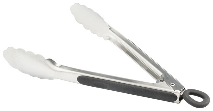 Tongs. Cooking kitchen tongs with soft-grip silicone handles. Durable stainless steel tongs with locking for cooking. Tongs with silicone rubber grips and metal tips for BBQ. Kitchenware for kitchen