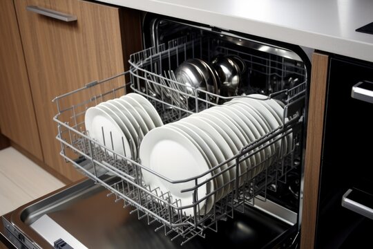 A dishwasher filled with lots of white plates. Perfect for kitchen-related designs and restaurant advertisements