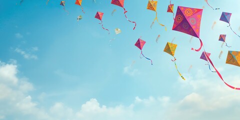 Indian festival Happy Makar Sankranti poster design with group  kites flying cloudy sky. abstract vector illustration design.
