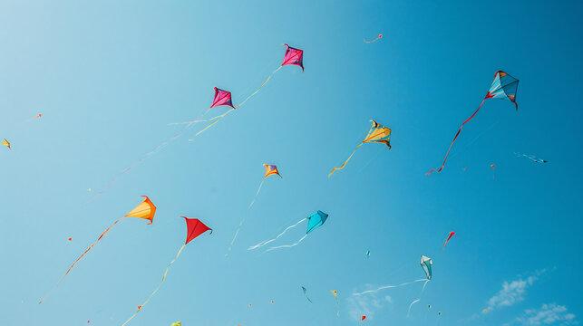 Colorful kites soaring in a clear blue sky, symbolizing joy and freedom on a sunny day