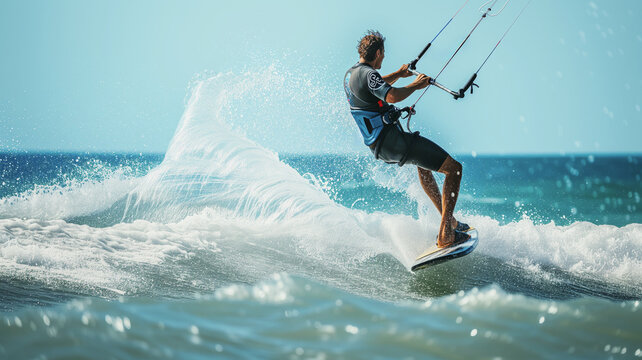 Man practices kitesurfing on the sea