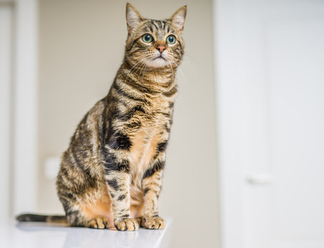 Isolated Siamese cat with blue eyes looking directly forward, sitting upright indoors