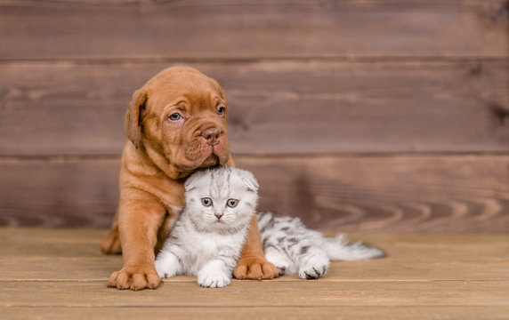 Cute Siberian kitten sitting in wooden box with pink flowers. Cat with spring flowers in pink box. Curious kitten peeking out of the box on the blurred background of spring nature. 8th March