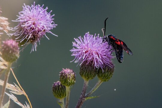 Vibrant red zygaena ephialtes moth perched delicately on a giant knapweed in the sunshine
