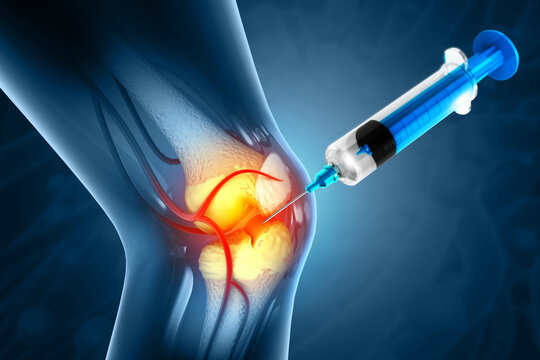 Injection into the knee joint. Drug treatment method for alleviating knee injuries in human. 3d illustration