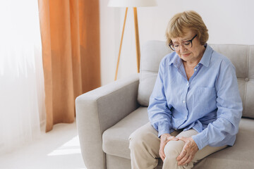 Body arthritis muscles stiff problem, aged woman suffering on leg, pain knee from disease chronic, hand massage rubbing joint injury, senior hurt or sore sitting on sofa at home. Health care people.