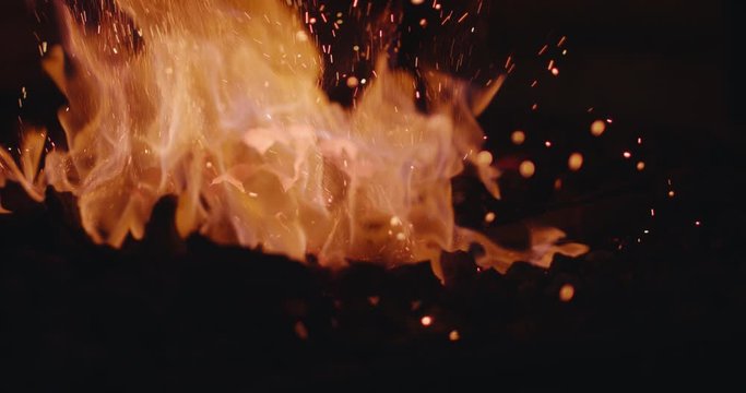 Blacksmith heating iron in fire making knife dark closeup