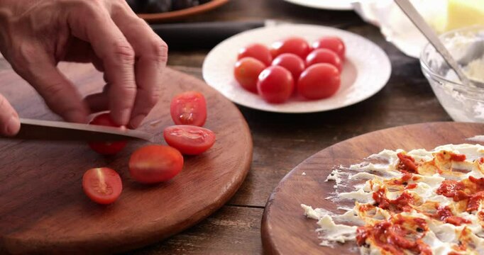 Butter board preparing, cutting cherry tomato using small kitchen knife making topping, close up