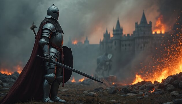 Mediaeval Teutonic knight in full armor stands on battlefield, sword drawn, shield ready. Burning castle in background, dramatic light. Represents history, war, courage, knighthood, crusader era,