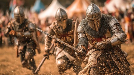 Knight riding horse through battlefield amidst fighting. Medieval warrior in full armor on warhorse charges into combat. Military campaign showing knighthood concept.