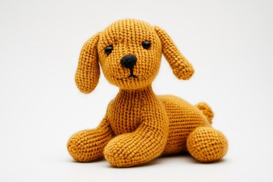 The knitted toy on a wooden table. Handmade. It can be used as a background