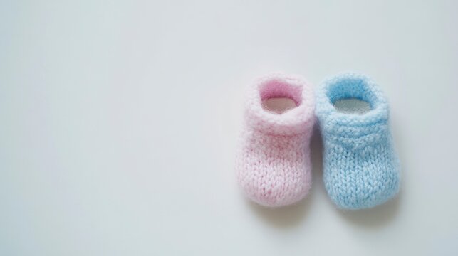 Photograph of two baby booties on a white background, in pastel pink and blue colors, with a minimalistic style.