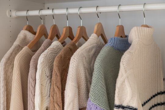 Warm beige wool pullover and knitwear and hanging in wardrobe