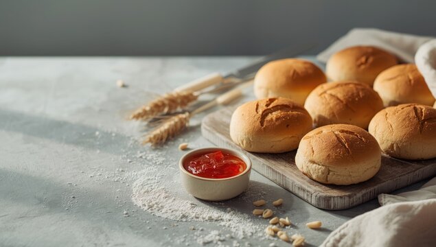 Close-up of warm buns topped with jam on a grey table, emphasizing bakery freshness, International Bread Day